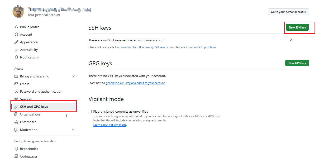 点击:头像 -> Settings -> SSH and GPG keys -> New SSH key