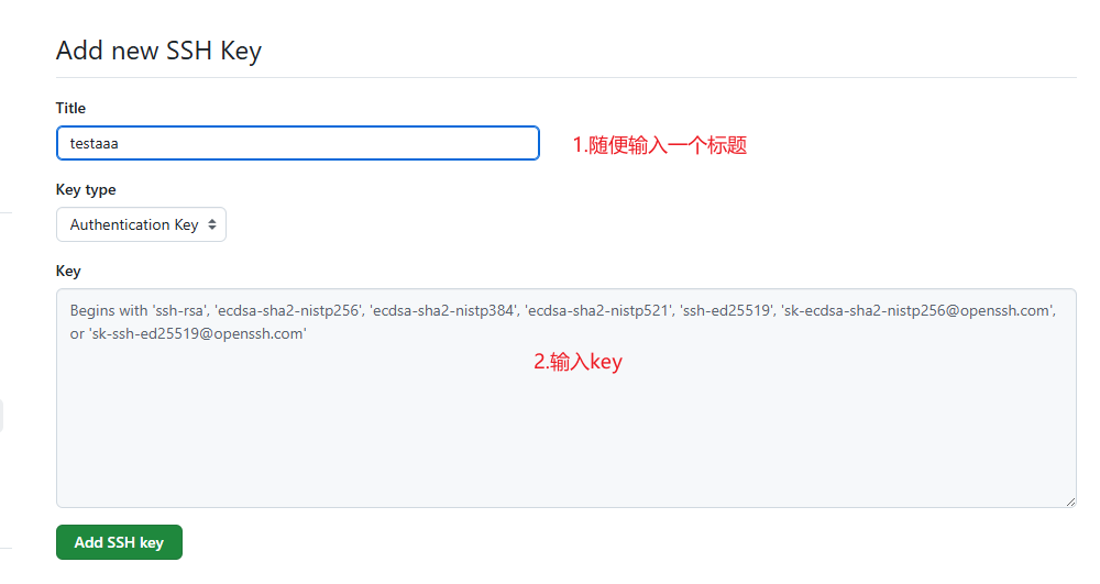 按照步骤进入 New SSH key,随便输入一个 Title,再把前面设备上生成的 key 粘贴进来保存即可。
