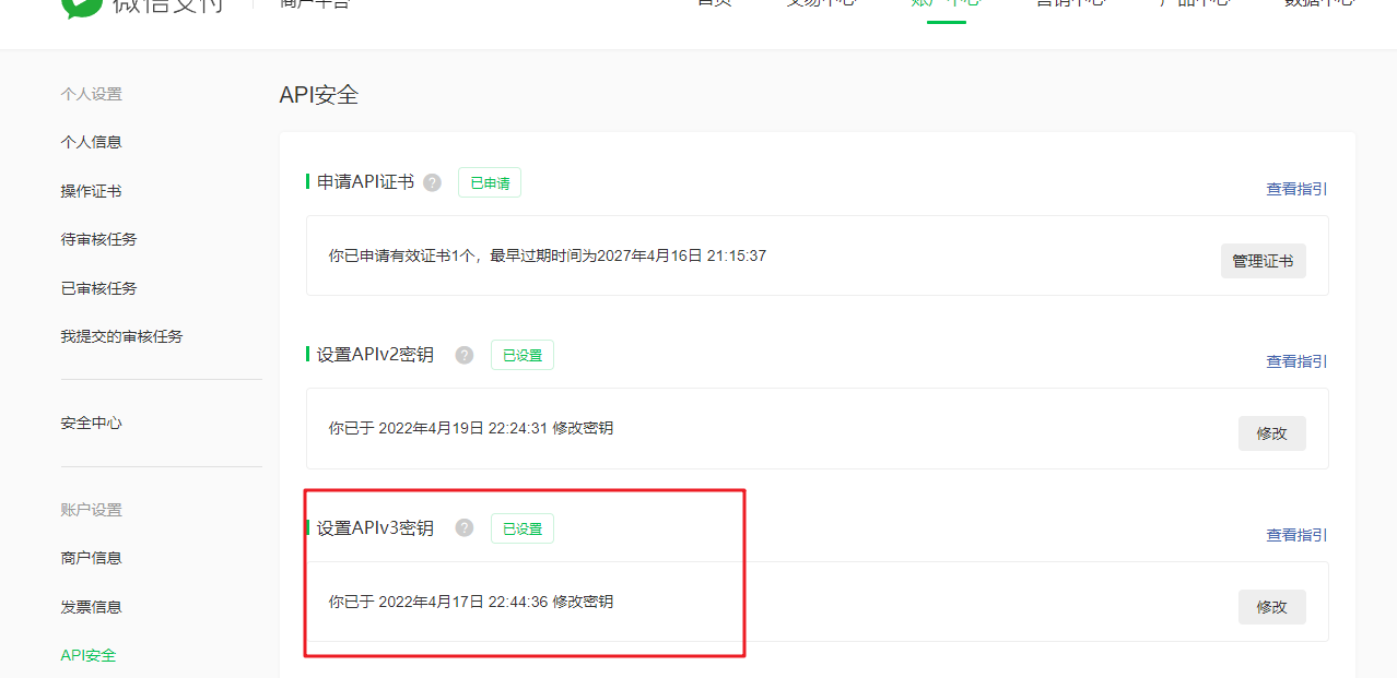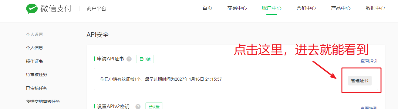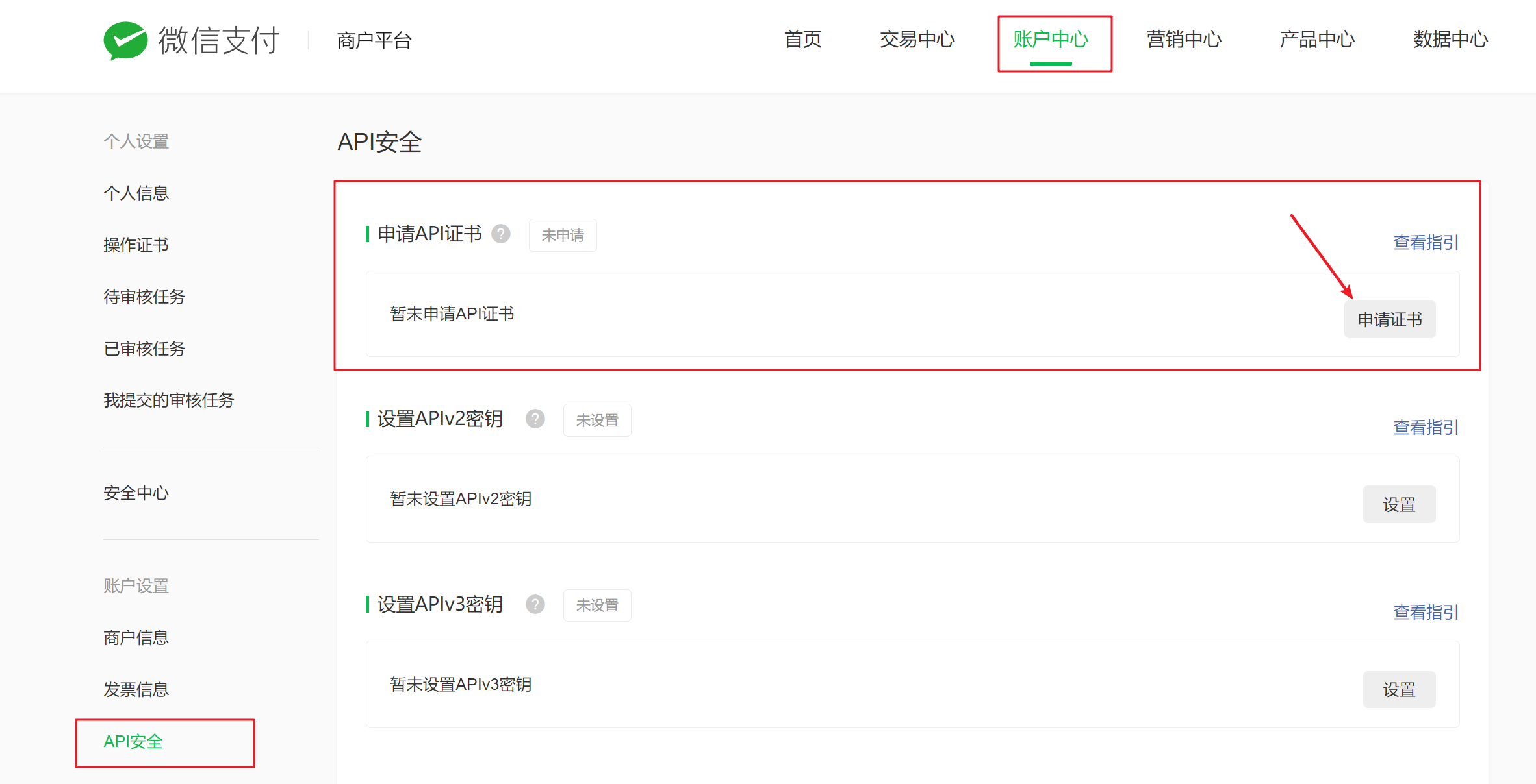 我们先登录微信支付商户平台进入【账户中心】->【API安全】