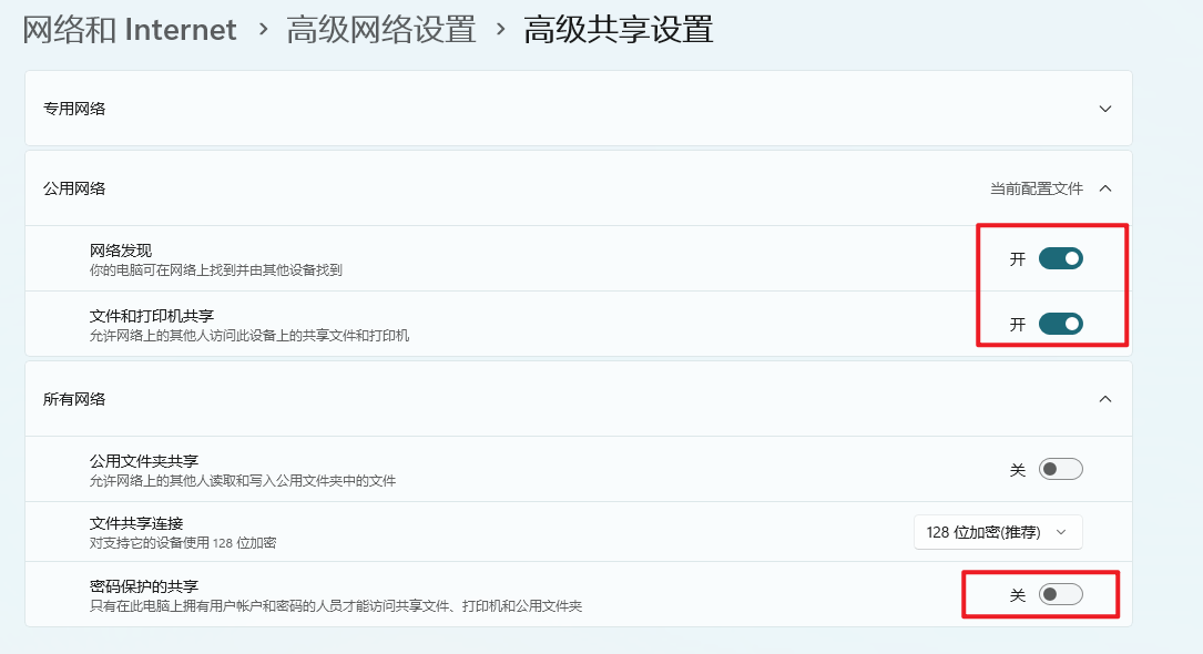 设置 → 网络和 Internet → 高级网络设置 → 高级共享设置