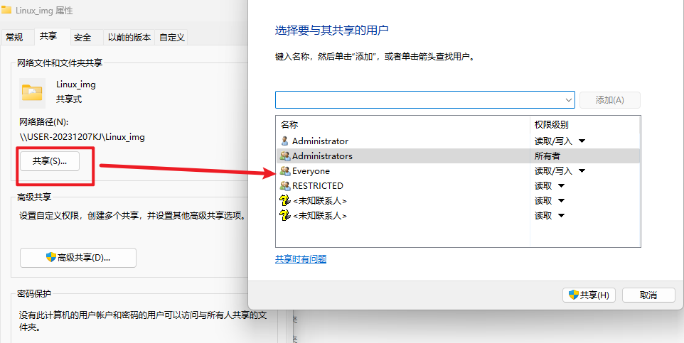 选择需要共享的文件夹:右键 → 属性 → 共享